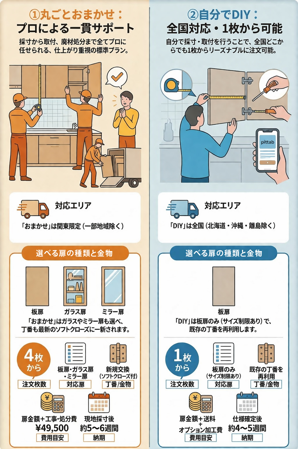 | 費用感 | 【扉価格✕枚数】+【採寸・運搬・取付工事・廃棄処分費¥49,500(税込)】 | 【扉価格(送料込)✕枚数】+(※指定エリア外送料)+(※穴加工費) |